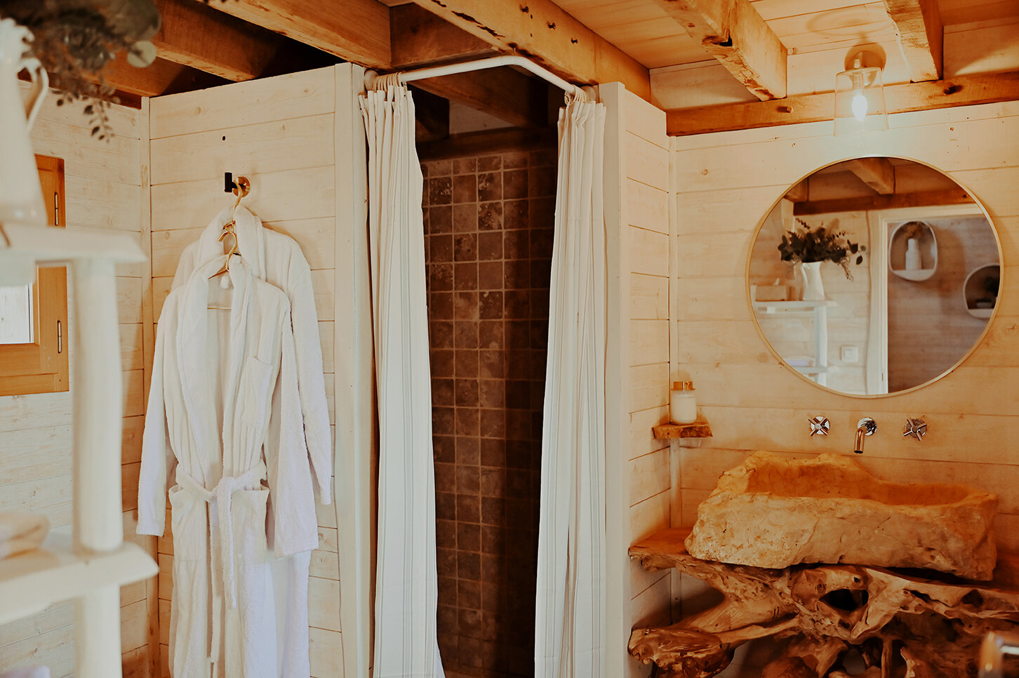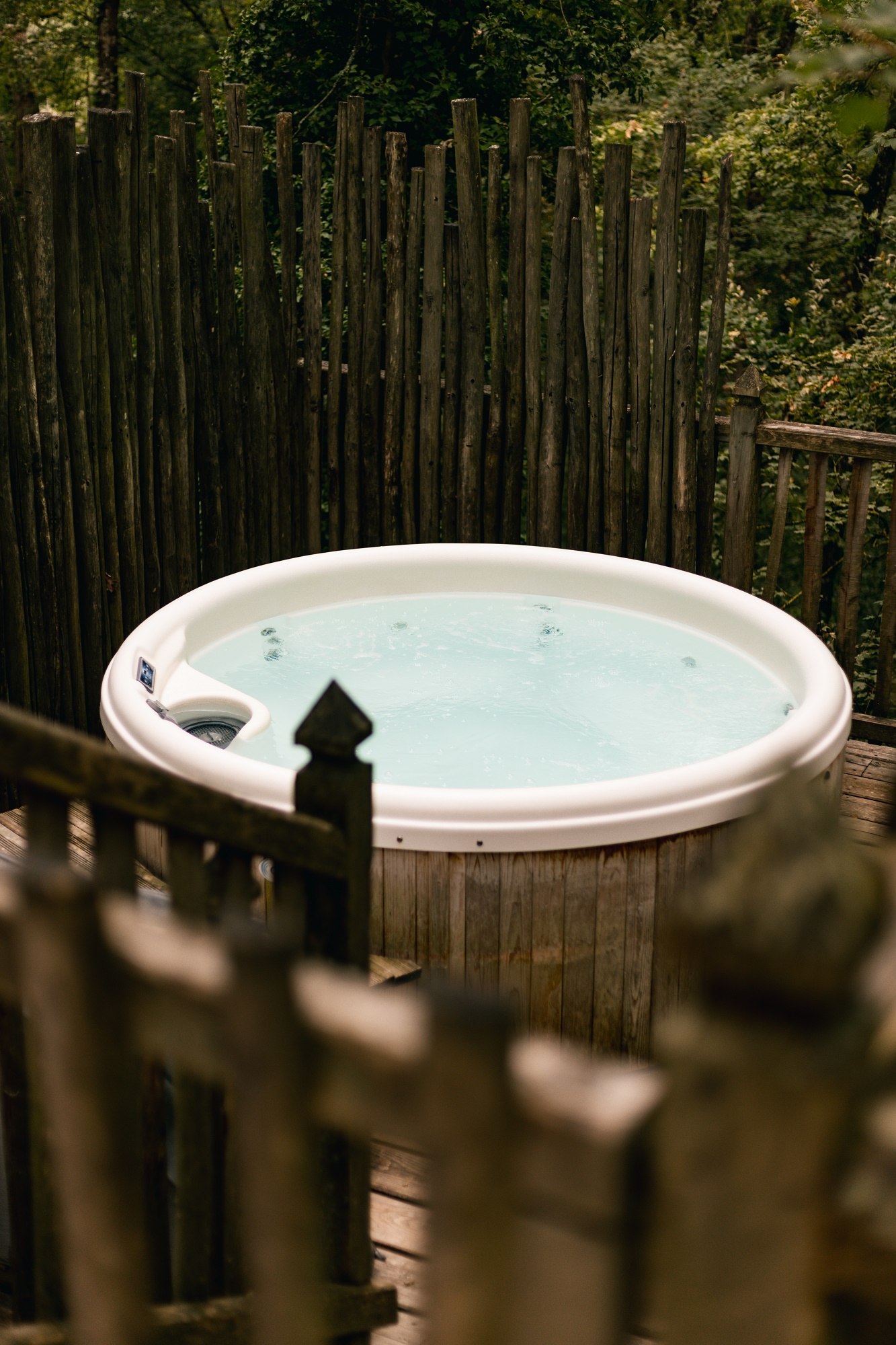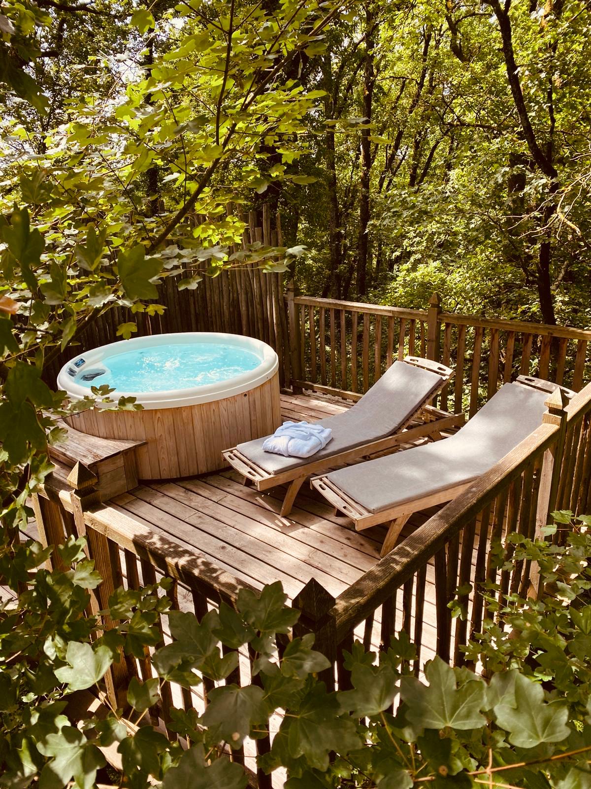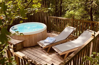 Depuis sa vaste terrasse, profitez d'un spa pour 4 personnes ou d'un moment de partage autour d'un repas et laissez-vous envoûter par la quiétude environnante et sa vue sur la canopée. A l'intérieur, le bois est à l'honneur, créant une ambiance chaleureuse et authentique.