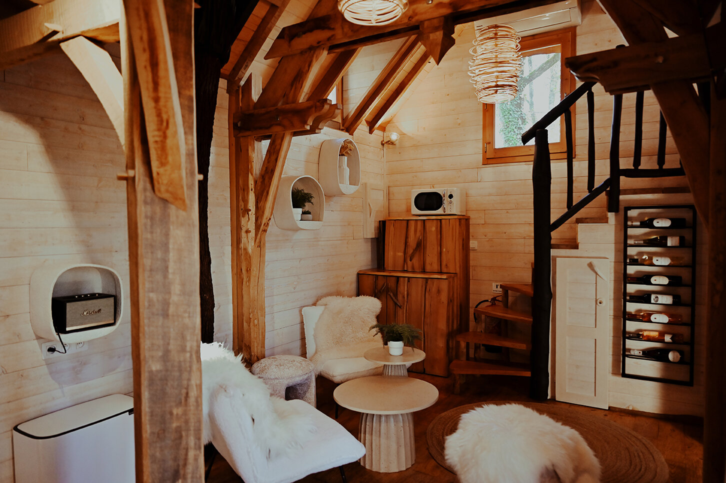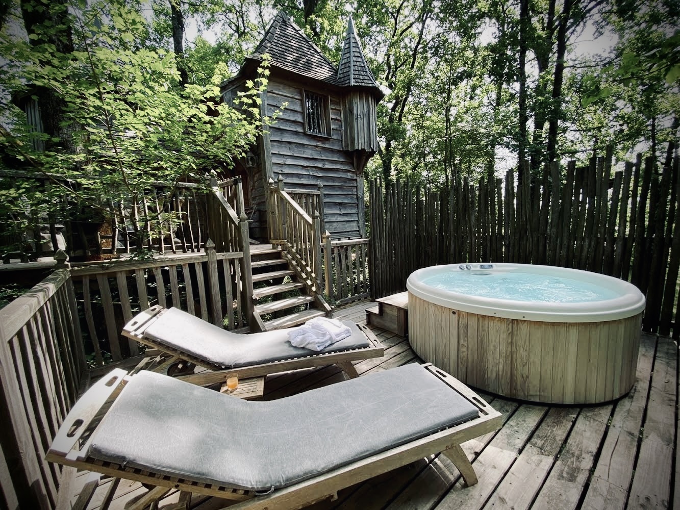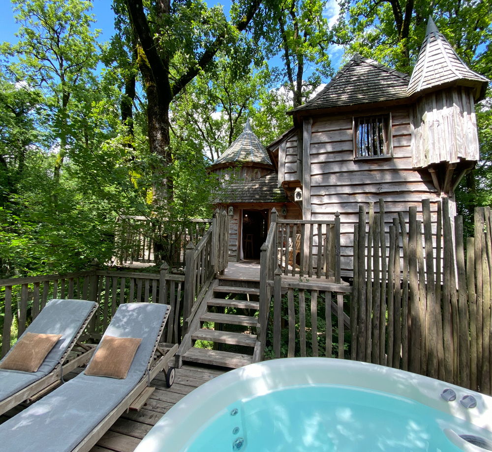 Nichée au cœur d'un bosquet de chênes, la cabane Milandes, est perchée sur pilotis, pour vous offrir un séjour unique en pleine nature. Idéale pour un week-end en famille ou entre amis en Dordogne, cette cabane perchée avec spa privatif vous invite à la détente et à l'évasion.